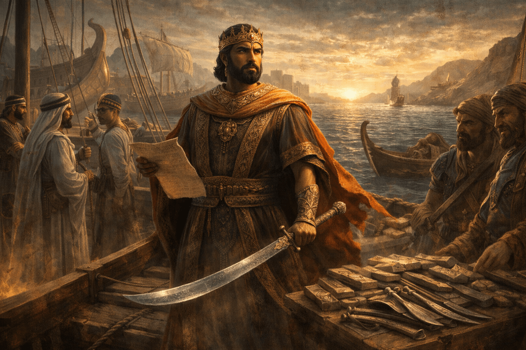 Immaginiamolo. Di giorno re di Tiro, ricevimenti, messaggeri, offerte ai templi, incontri con emissari egizi. Di notte, o comunque nelle ore meno protocollari, supervisione di carichi di rame, stagno, ferro, armi e chissà cos’altro diretti verso approdi dove nessuno faceva troppe domande. La Fenicia, in fondo, aveva una specialità antica e rispettabilissima: sapere dove trovare le cose e a chi venderle.